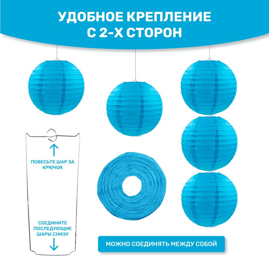 В комплект входит 8 бумажных фонариков и лента атласная.