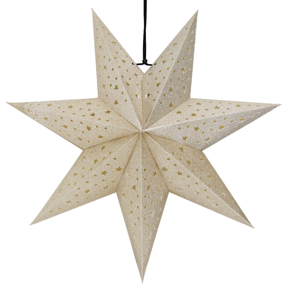 Семиконечная объемная звезда 45 см — великолепный декор из тонкого перфорированного картона с золотыми блестками. Создает красивые световые эффекты. Поставляется в сложенном виде, в комплекте шнур для фиксации объема и подвеса.